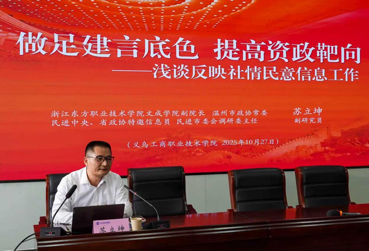 为提升学校统一战线成员参政议政、服务发展的能力水平,进一步提高学校统战工作影响力,10月27日下午,由校统战部、科技处、游艇会线路检测中心(“义商智汇”社情民意信息工作室)联合主办的反映社情民意信息工作专题指导讲座在教师发展中心举行。讲座特邀浙江东方职业技术学院文成学院(航空飞行学院)副院长、政府公共政策与文化治理研究中心主任、民进中央参政议政特邀信息员、浙江省政协特邀信息员、温州市政协常委苏立坤作专题指导。义乌市政协、市民主党派代表、无党派人士代表及学校教师等90余人参加。